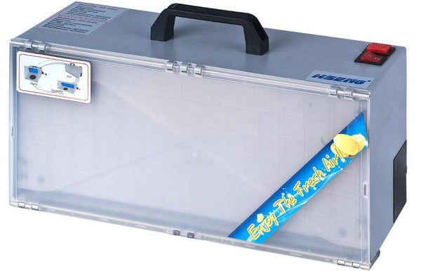Spritzkabine für den sicheren Umgang mit Farbdämpfen. Die Kabine kann gefaltet werden, sie hat ein geringes Gewicht und die ideale Größe. Ein Drehteller ist im Gerät installiert. Es können auch zwei Geräte gekoppelt werden, somit wird die Lackierfläche verdoppelt. Mit kleiner elektrischer Leistung wird eine große Luftströmung erzeugt, der Filter mit hoher Dichte filtert die meisten Farbdämpfe und Feuchtigkeit aus. Ausgestattet mit einem international einsetzbaren Netzteil, verwendbar von 110 – 240 V/50 oder 60 Hz. Gerätedaten: Motor: DC 12V, 1,6 A Eingangsleistung: AC 100 – 240 V, 50/60 Hz Luftdurchlass: 4 m³/Minute Geräuschpegel: 45 dB Abmessungen aufgebaut: 42 x 48 x 34 cm Abmessungen gefaltet: 42 x 15 x 25 cm Gewicht: 3,5 kg.