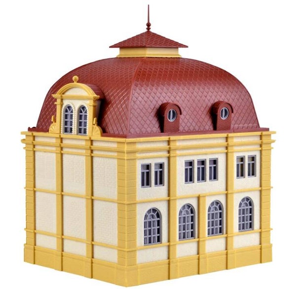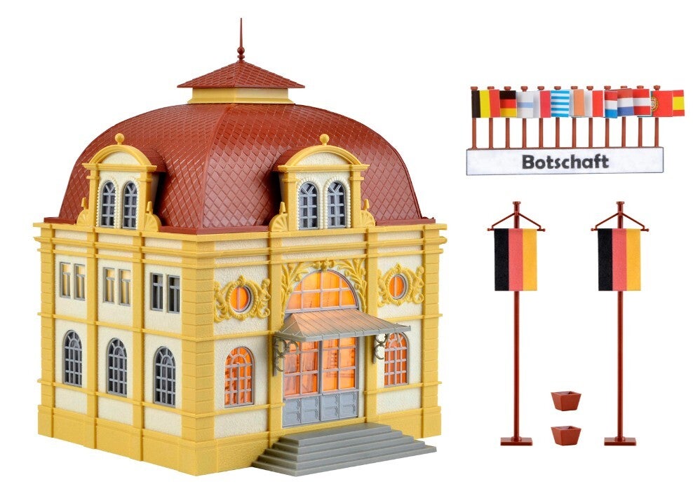 Dieses imposante Gebäude dient als Botschaftssitz. Dem Bausatz liegt die praktische und variable Etageninnenbeleuchtung von Viessmann bei. Diese bietet unbegrenzte Möglichkeiten zur individuellen Beleuchtung von Gebäuden mit großen Fensterfronten.