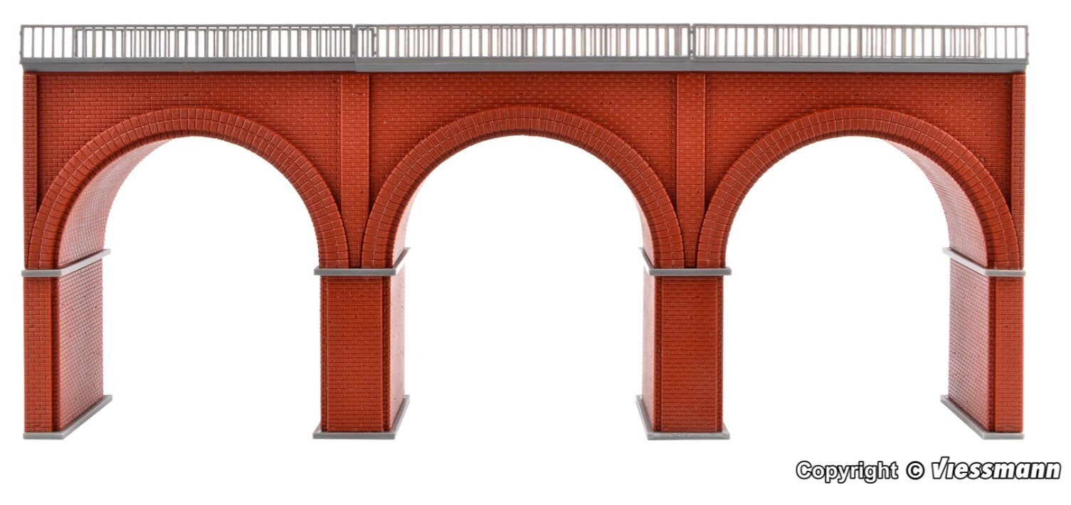 Das Viadukt mit Gleisbett und 3 Bögen ist eine ideale Brückenkonstruktion für jede Anlage mit normalem Platzangebot. Mit dem einzelnen Bogenelement Art. 42512 kann das Viadukt beliebig erweitert werden. Für alle gängigen Gleissysteme geeignet.