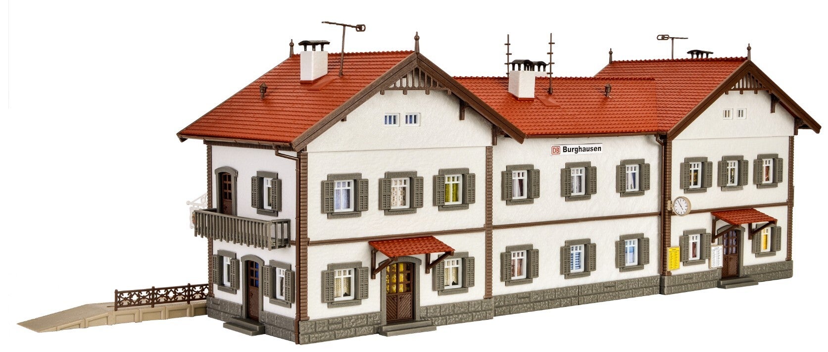 Der Bahnhof Burghausen macht richtig Lust auf Ferien in Deutschland. Ankommen und sich wohlfühlen! Er ist mit 44,6 cm Länge ein stattliches Empfangsgebäude mit zwei Seitenflügeln und einem Mittelbau. Die dreieckigen Erker zur Bahnseite lockern die Fassade auf, der Haupteingang zur Straßenseite ist überdacht. Der Bahnsteig am Gebäude ist enthalten.