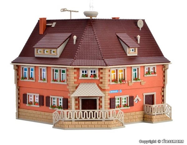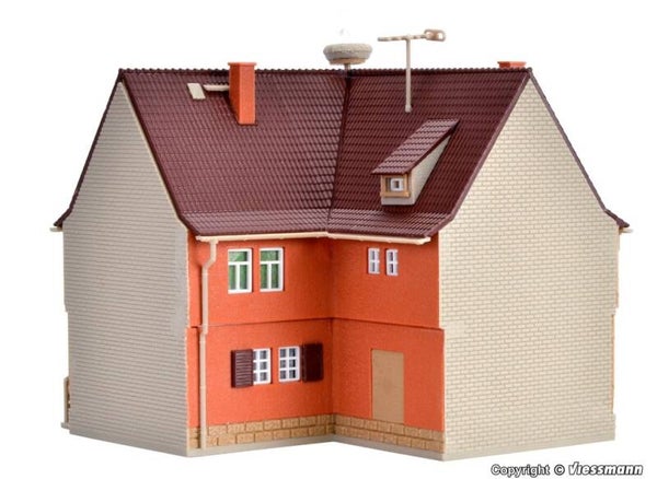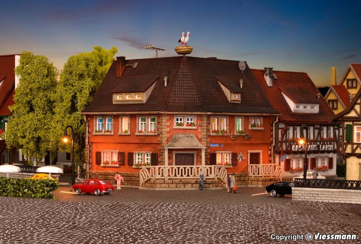 Mit den Bausätzen der Vollmer Marktstraße 2 – 6 können Sie einen kompletten Straßenzug mit Wohn-, Geschäfts- und Fachwerkhäusern gestalten. Bereits mit 3 Bausätzen schaffen Sie sich eine preiswerte und abwechslungsreiche Häuserfront. An diesem Eckhaus fällt besonders der überdachte Treppenaufgang mit dem filigranen Geländer ins Auge. Ein besonderes Detail ist das Storchennest auf dem Dach.