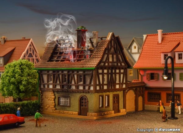 Dieses Gebäude mit ausgebranntem Dachstuhl kann mit der beiliegenden Farbtablette individuell gealtert werden. Mit den Rauchgeneratoren aus dem Vollmer Sortiment, z. B. Art. 49600 und einem entsprechenden Rauchdestillat erzeugen Sie den passenden Rauch.