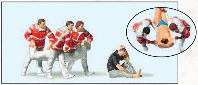 Preiser 10567 Sanitäter mit Bergetuch, Verletzte