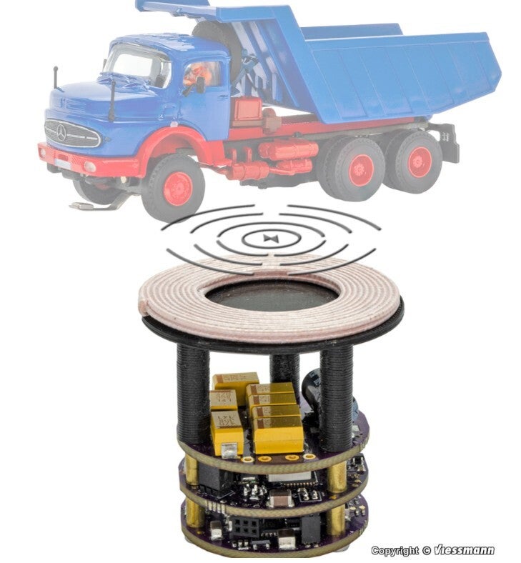 Der InduktivCharger ermöglicht das kabellose Nachladen von Fahrzeugen sowie induktive Kommunikation mit dem Fahrzeug. Fahrzeuge halten auf dem Modul und positionieren sich automatisch über der Ladespule, wobei Ladeströme selbstständig abgestimmt werden. Diese Module eignen sich besonders für Standorte mit längeren Haltezeiten wie Ampeln, Bahnübergänge oder Tankstellen. Mehrere Module können mit kommenden Softwareupdates vernetzt werden, um Fahrzeuge autonom zu Ladepositionen zu steuern. Ein Steuerausgang für den motorischen 2/3-Wege Abzweig Art. 8448, der auch Servos ansteuern kann, rundet die Möglichkeiten ab. Bei den LKW beträgt das Verhältnis von Fahrzeit zu Ladezeit ca. 3 zu 1. Quasi unbegrenzte Fahrzeit ist dadurch möglich. Der InduktivCharger kann auch Fahrzeuge mit Empfängerspulen ein- und ausschalten. Die Fahrzeuge müssen mit der Empfängerspule Art. 8440 nachgerüstet werden.
