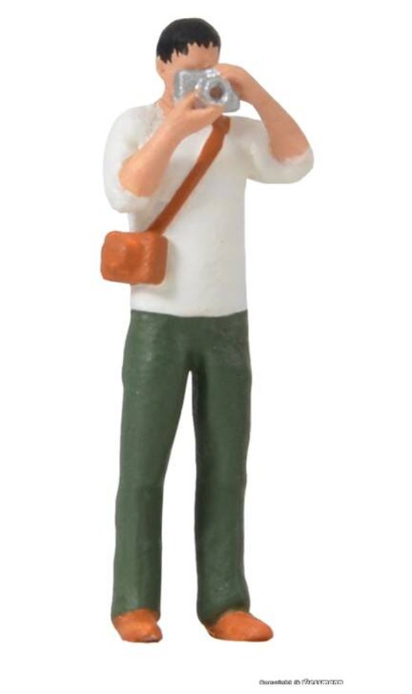 Dokumentiert das Leben auf der Modellbahn: Fotograf mit Apparat und funktionsfähigem Blitz. In unregelmäßigen Abständen blitzt durch eine Mikro-LED simuliertes Blitzlicht aus dem Fotoapparat. Einbautiefe: 39 mm.
