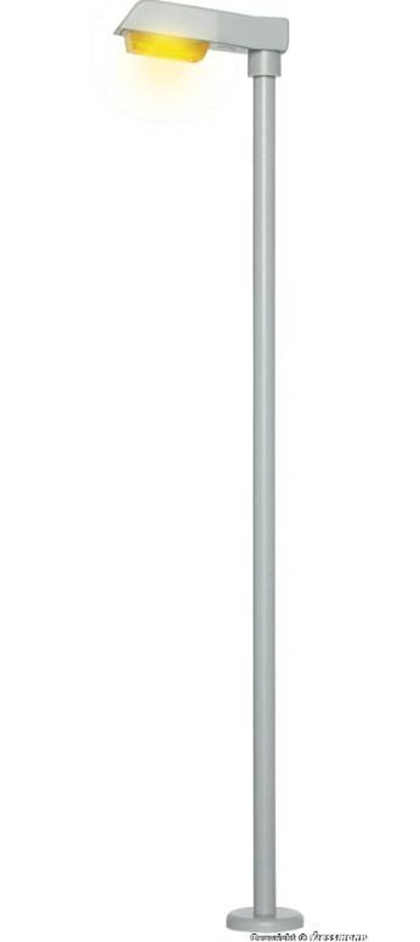 Moderne Straßenleuchte der Epochen IV – VI. Vorbildgetreuer Messingmast mit Steckfuß für eine besonders einfache Montage. Wartungsfrei dank LED-Beleuchtung. Höhe: 10 cm.