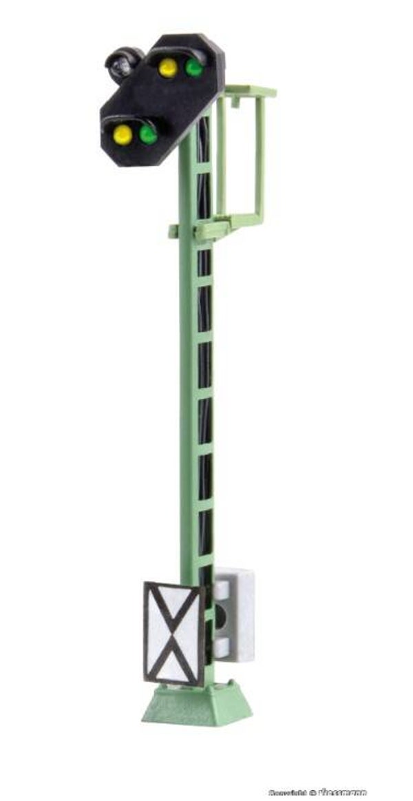 Signal der Einheitsbauart. Messingmast in filigraner Fotoätztechnik hergestellt. Originalgetreue Lackierung. Für alle Analog- und Digitalsysteme geeignet. Mit Steckfuß. Sehr einfache Montage, sehr einfacher Anschluss. Mit 5 LEDs, wartungsfrei. Signalbilder Vr0, Vr1 und Vr2. Passendes Steuermodul: Art. 5220. Höhe: 6 cm.