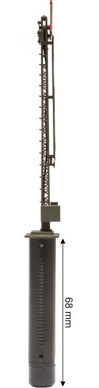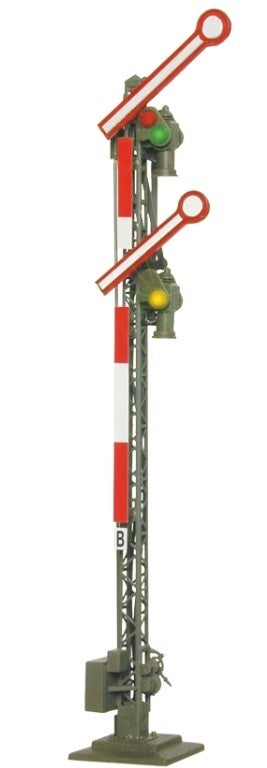 Mit filigranem Gittermast aus Messing in originalgetreuer Lackierung, bedruckten Signalflügeln und Unterflur-Kompaktantrieb mit integrierter Zugbeeinflussung. Wartungsfrei dank LED-Beleuchtung. Signalbilder Hp0 und Hp2. Höhe: 103 mm.