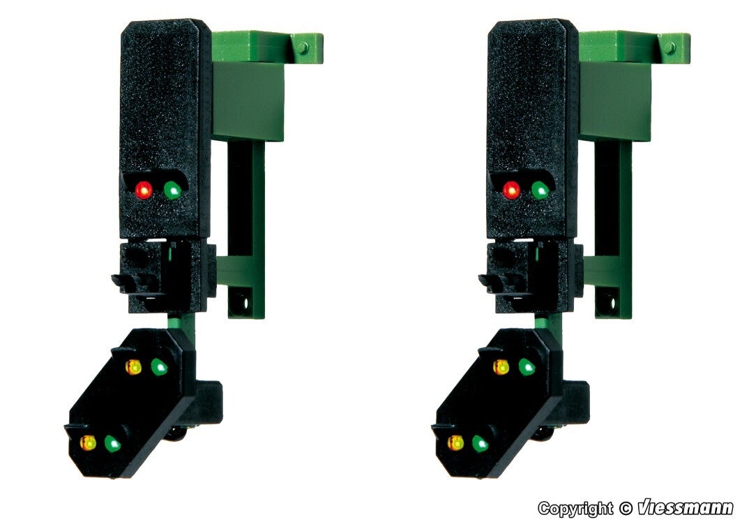 Signalköpfe nach Bauart 69 ohne Mast, aber komplett verkabelt. Zur Montage an Gebäuden (z. B. kibri Brückenstellwerk Hamm Art. 39310) oder an den Signalbrücken Art. 4750 und 4755. Die Signalköpfe werden am Ausleger der Signalbrücke eingeklipst und lassen sich daher leicht austauschen. Anschluss an die Steuermodule Viessmann Multiplexer Art. 5229 oder 52292. Mit Stecker und 6 LEDs, wartungsfrei.