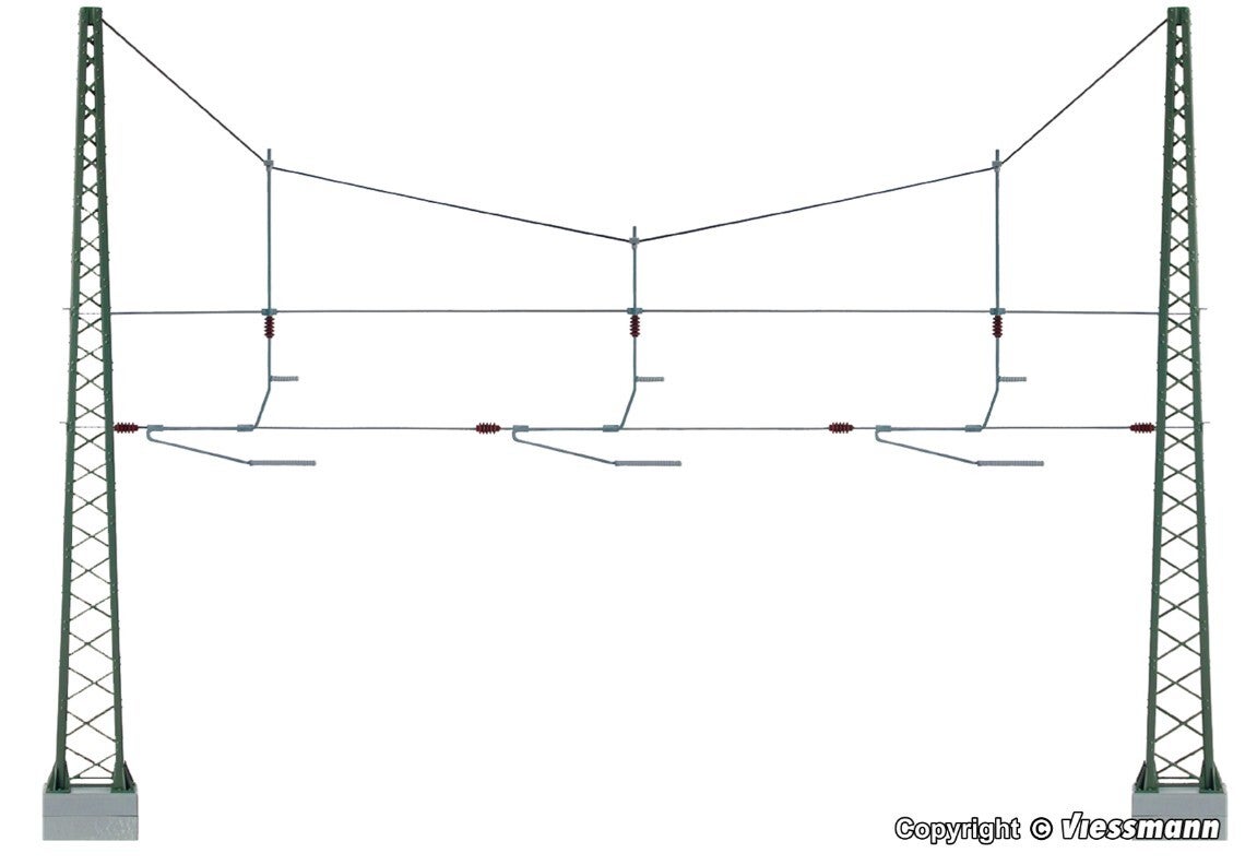 Komplett montiert und lackiert. Die Gleisabstände sind beliebig wählbar und die 3 Gleise sind elektrisch getrennt. Filigrane Metallausführung mit eingeprägten Nietenimitationen. Maximaler Mastmittenabstand: 23,5 cm, Höhe: 15 cm.