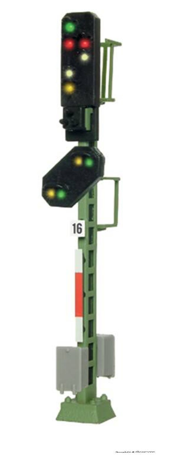 Signal der Einheitsbauart. Filigraner Messingmast in originalgetreuer Lackierung. Mit Steckfuß für einfache Montage. Mit 10 LEDs, wartungsfrei. Signalbilder Hp0, Hp0/Sh1, Hp1, Hp2, Vr0, Vr1, Vr2. Passende Steuermodule: Art. 5220 und 5223.