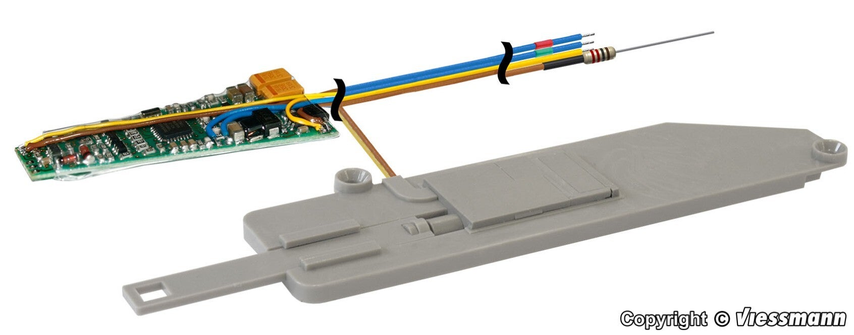 Dieser spezielle Weichenantrieb ist ein kraftvoller, geräuscharmer Antrieb mit zugehörigem Digitaldecoder zum Einbau in Märklin und Trix C-Gleissystemweichen. Der Decoder befindet sich als Baugruppe im Kabel, daher ist der Antrieb besonders kompakt. Der Weichenantrieb zeichnet sich durch vorbildgerecht langsame Bewegung der Weichenzungen aus. Geschwindigkeit und Bewegungsablauf sind elektronisch gesteuert und gewährleisten einen feinfühligen Antrieb. Wenn aufgrund der Eigenschaften Ihrer Weiche die Bewegungsrichtung nicht mit der Schaltrichtung auf Ihrem Eingabegerät übereinstimmt, können Sie im Digitalbetrieb die Stellrichtung des Antriebs invertieren. Der zugehörige Decoder versteht die Formate Märklin-Motorola und DCC und kann die angeforderte Soll- oder Ist-Stellung per RailCom an geeignete Digitalzentralen, z. B. Viessmann Commander Art. 5300/5320, zurückmelden. Er kann aber auch analog betrieben werden. Zusätzliche Schaltausgänge für Relais oder LEDs sowie für konventionelle Stellungsrückmeldung und Herzstückpolarisation vervollständigen den Funktionsumfang. Deren Funktion ist konfigurierbar.