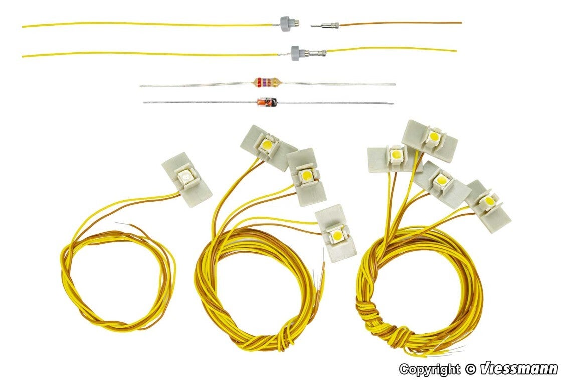 Ideal für die Beleuchtung der kibri Kubushäuser, Art. 38336 – 38339 aus Polyplate. Inhalt: 4 warmweiße, 3 weiße und 1 gelbe LED. 1 Diode und 1 Widerstand, 2 IC Stecker. Perfekt zum Anschluss an den Viessmann LED-Dimmer, Art. 5590.