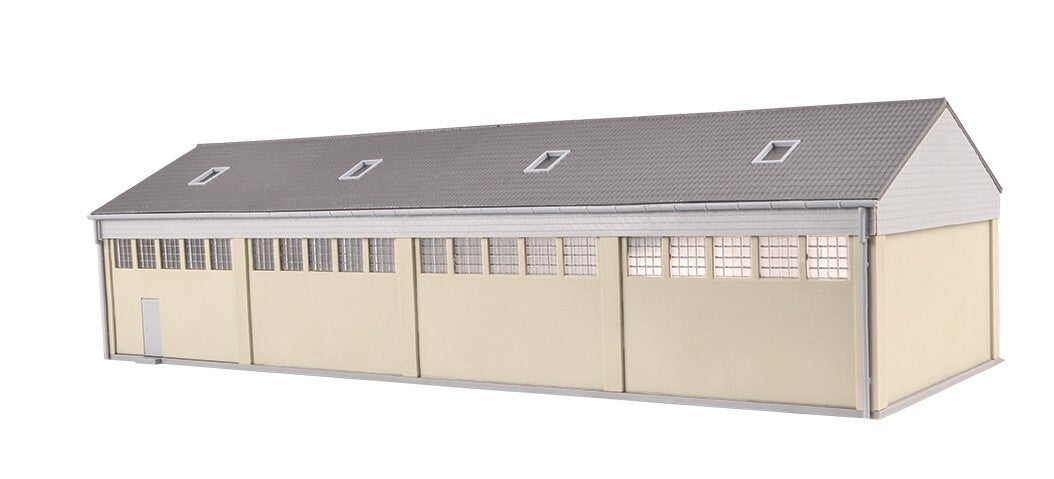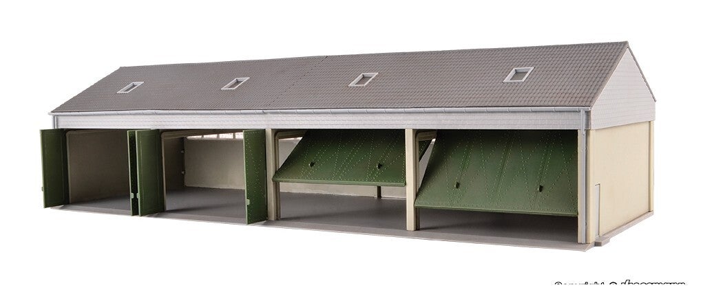 Bausatz. Dieser vorbildgerechte Garagenbau bietet eine ansprechende Unterbringung für mindestens 4 Lastwagen oder Einsatzfahrzeuge. Das Gebäude eignet sich hervorragend zur Inszenierung von Kasernenbetrieb und dazugehöriger Logistik. Die 4 breiten Rolltor- Nachbildungen erlauben auch das Einfahren von Lastwagen mit Plane. Die Innenlänge reicht aus für ein ca. 8 cm langes Fahrzeug.