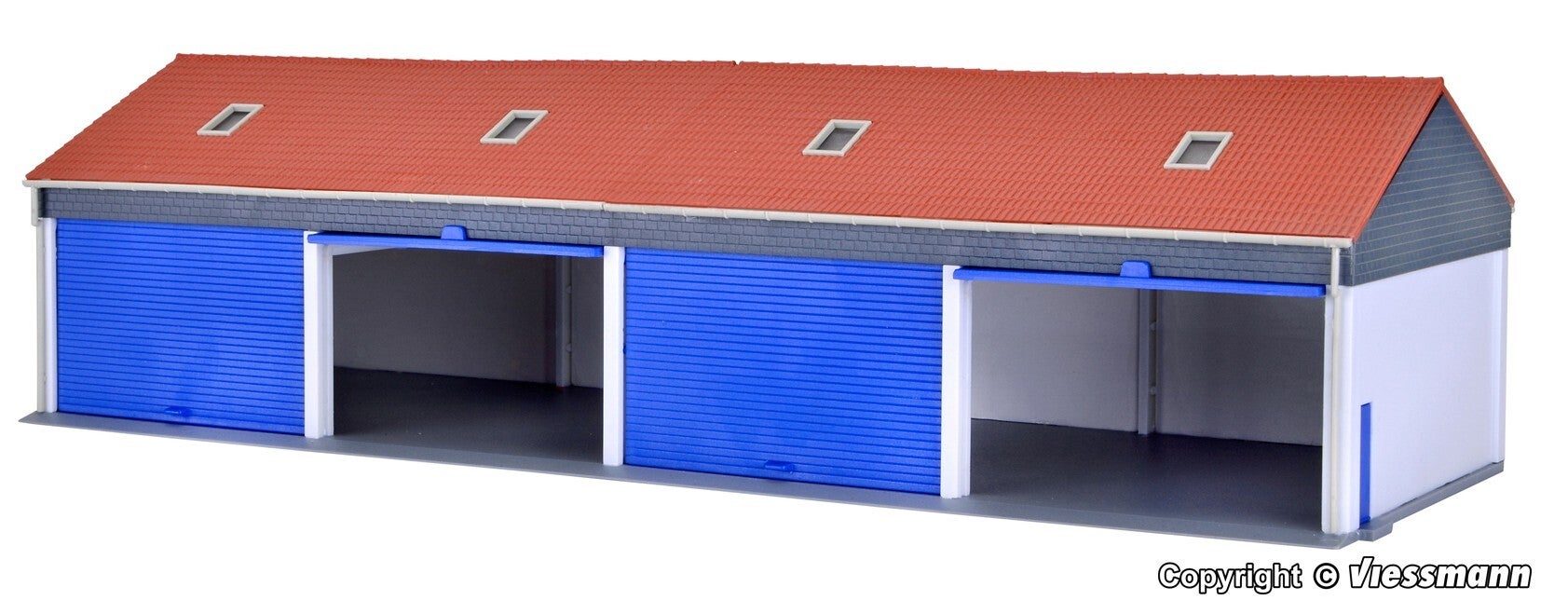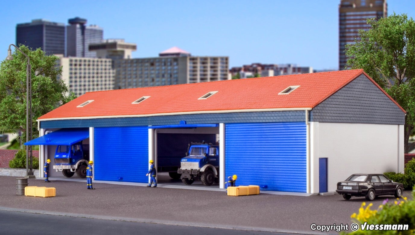 Dieser moderne Garagenbau bietet eine ansprechende Unterbringung für mindestens 4 Lastwagen oder Baumaschinen. Das Gebäude eignet sich hervorragend zur Inszenierung von Betriebshöfen der Transport- und Bauunternehmen, kommunalen Bauhöfen u.a. Die 4 breiten Rolltor-Nachbildungen erlauben auch das Einfahren von Lastwagen mit Plane. Die Innenlänge reicht aus für ein ca. 8 cm langes Fahrzeug.