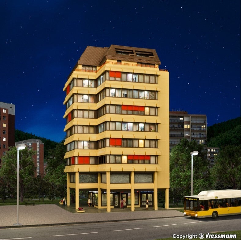 Dieser Klassiker für die Epochen III und IV ist mit dem Viessmann Startset Art. 6045 ausgestattet. Das sorgt für eine vorbildgerechte Etagenbeleuchtung. Auch Eckfenster können damit realistisch beleuchtet werden.