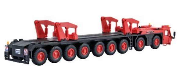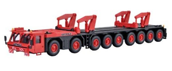 Vorbilddaten: Für den Auslegertransport des bislang größten Teleskopkranes der Welt AKM 1000-103 entwickelte die Firma GOTTWALD ein spezielles Transportfahrzeug mit der Bezeichnung TR 800-93. Dieses 9-achsige Fahrzeug wird von einem MERCEDES-BENZ Dieselmotor mit 12 Zylindern und einer Leistung von 452 kW/615 PS angetrieben. Auf der Oberseite des Fahrgestells ist eine Hebe- und Verschiebeeinrichtung montiert. Sie ermöglicht das Ausrichten des Auslegers mit dem Kran. Die Vorrichtung dient gleichzeitig als Halterung und Befestigung des Auslegers auf dem Fahrzeug beim Transport. Beim Aufbau des Teleskopkranes fährt das Transportfahrzeug an diesen heran. Der Teleskopmast wird dann mit dem Auslegerfuß des Kranes verbolzt und angehoben. Bei Bedarf kann das Transportfahrzeug auch zum Befördern sonstiger sperriger Lasten verwendet werden.