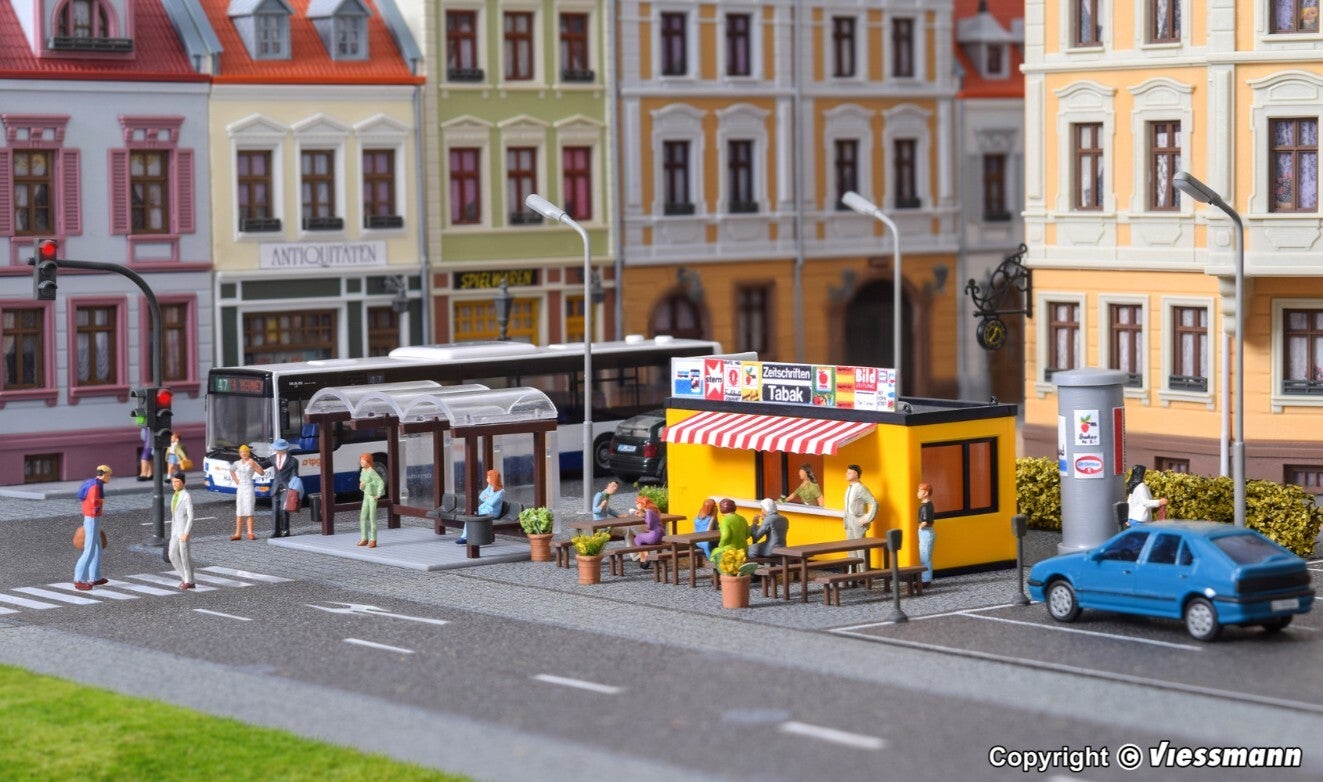 Das Set besteht aus Bushaltestelle, Haltestellenschild, Litfaßsäule mit Flachdach, Verkehrsampeln und 16 Parkuhren, einem Kiosk, Tischen, Bänken, Stühlen, Tisch, dazu 3 Haftetiketten mit Plakaten und anderen Werbeträgern zum Bekleben des Kiosks oder der Litfaßsäule und Straßenmarkierungen in weiß (Richtungspfeile, Fußgängermarkierungen u. a.) und 10 stehenden Figuren.