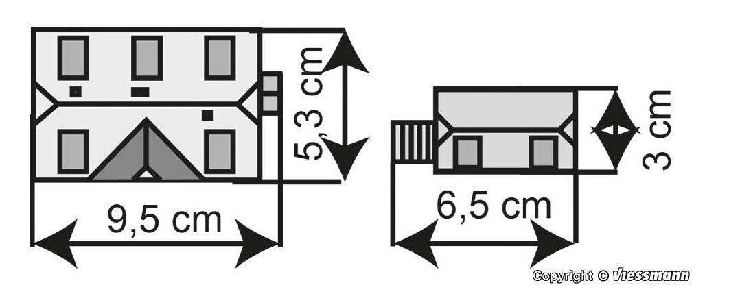 Masse: Hauptgebäude L 9,5 x B 5,3 x H 8,0 cm, Nebengebäude L 6,5 x B 3,0 x H 4,0 cm