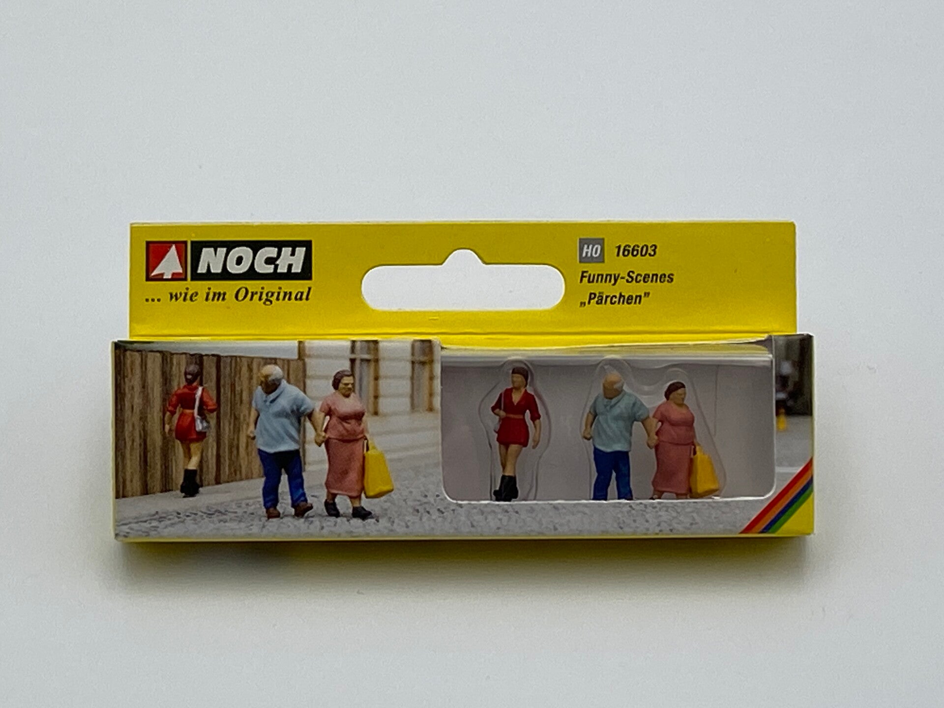 Mit Funny-Scenes “Pärchen” bringt NOCH eine witzige und lebendige Szene in Ihre Modelllandschaft! Das Set zeigt ein Ehepaar, das Hand in Hand unterwegs ist – allerdings hat der Herr den Blick nicht bei seiner Partnerin, sondern lässt sich von einer jungen, selbstbewussten Dame in Stiefeln und modischer Kleidung ablenken. Die ältere Dame an seiner Seite wirkt nicht allzu begeistert von seinem Interesse an der Fremden, was der Szene einen amüsanten, lebensnahen Charakter verleiht.