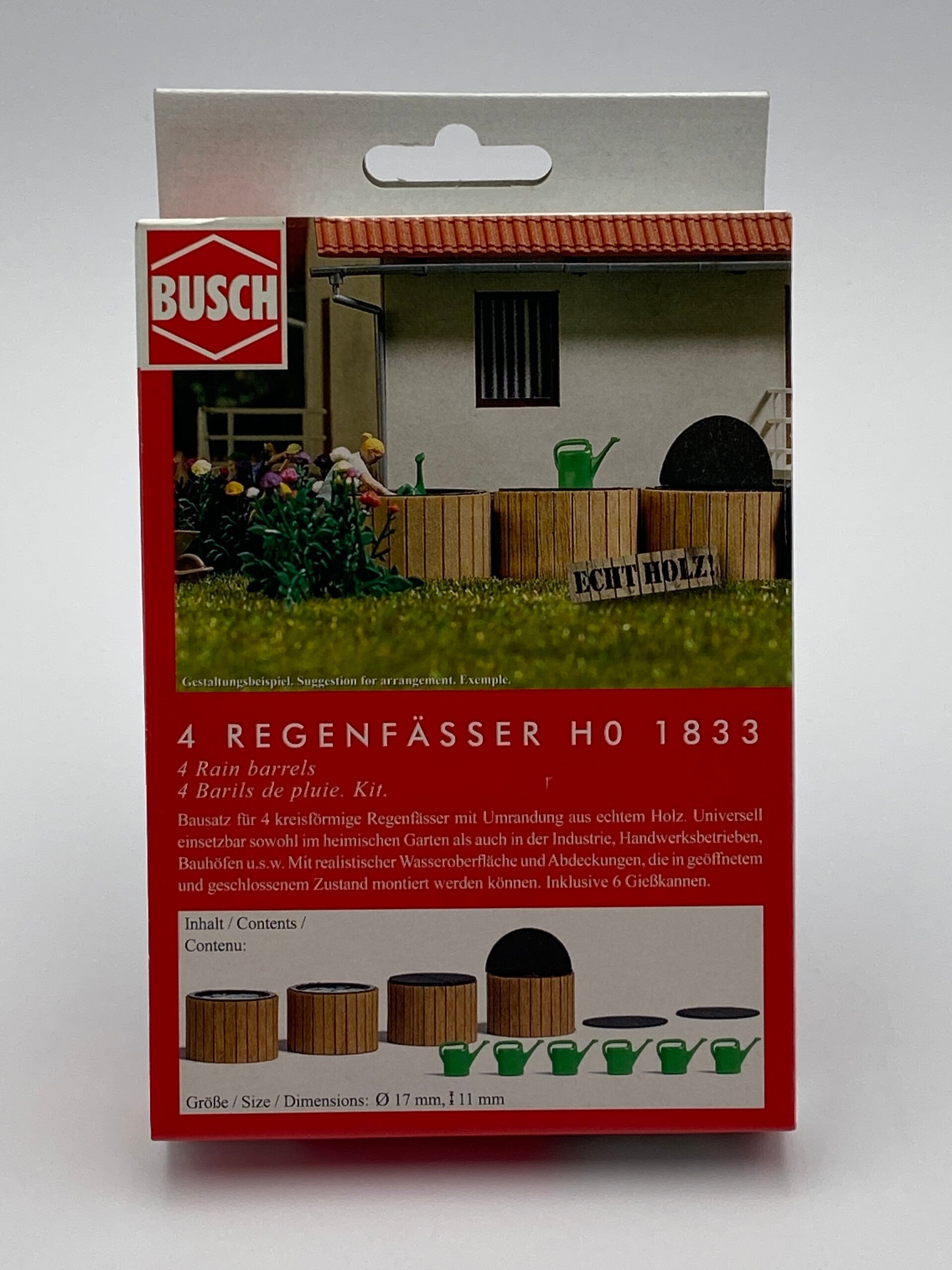 Bausatz für 4 kreisförmige Regenfässer mit Umrandung aus echtem Holz. Universell einsetzbar sowohl im heimischen Garten als auch in der Industrie, Handwerksbetrieben, Bauhöfen u.s.w. Mit realistischer Wasseroberfläche und Abdeckungen, die in geöffnetem und geschlossenem Zustand montiert werden können. Inklusive 6 Gießkannen.