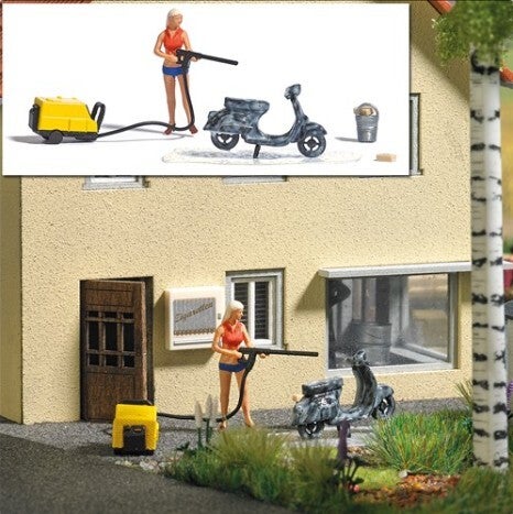Action Set für die realistische Belebung Ihrer Modellwelt. Eingeschäumter Motorroller auf Schaumfleck, Hochdruckreiniger, Eimer, Schwämme und Frauenfigur.