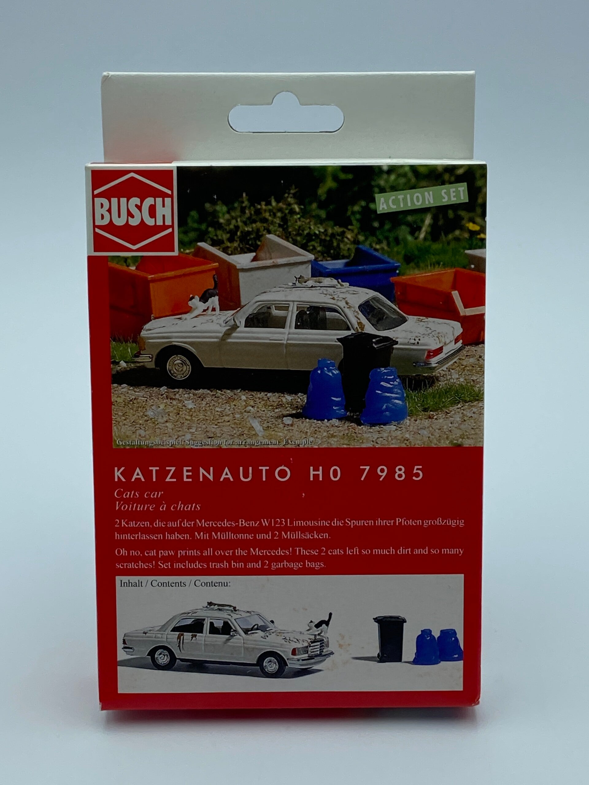 2 Katzen, die auf der Mercedes-Benz W123 Limousine die Spuren ihrer Pfoten großzügig hinterlassen haben. Mit Mülltonne und 2 Müllsäcken.