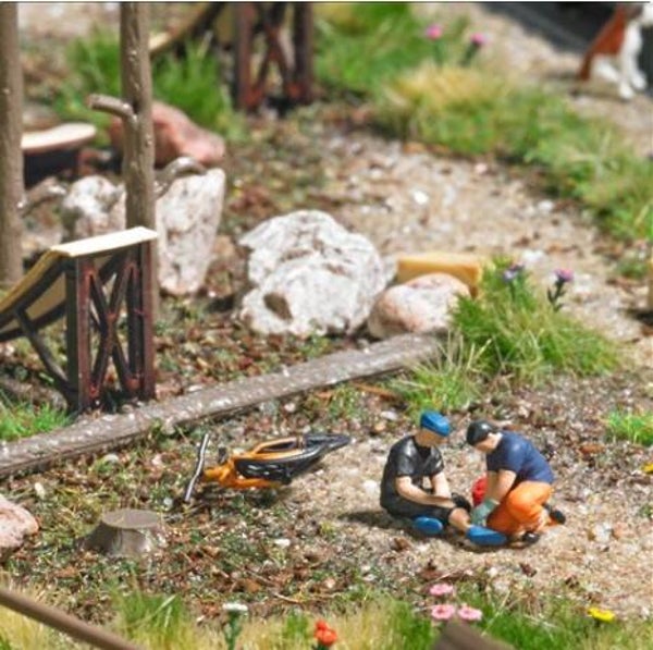 Für die realistische Belebung Ihrer Modellwelt. Mit thematischem Zubehör und mindestens einer Figur (bemaltes Fertigmodell) in passender Position.Hilfe, Unfall auf dem Bike-Trail! Die Einsatzkräfte sind schnell zur Stelle und helfen dem Gestürzten wieder auf die Beine.
