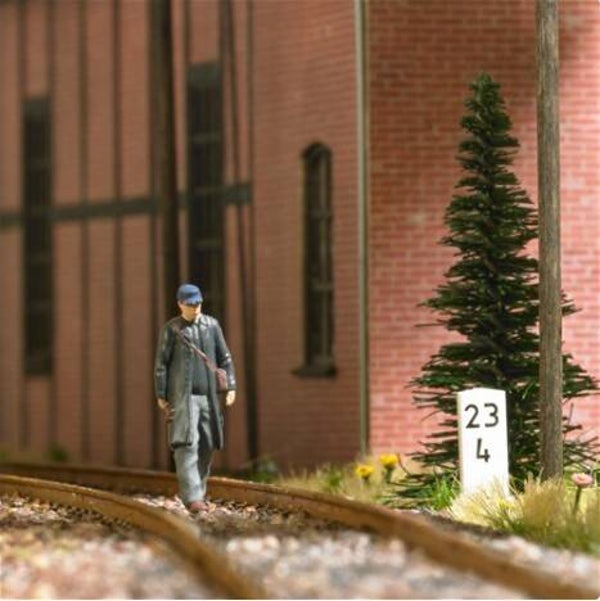 Ein Streckenläufer unterwegs auf Kontrollgang entlang der Gleise. Action Set mit Figur, Kilometersteinen und 2 Fichten.