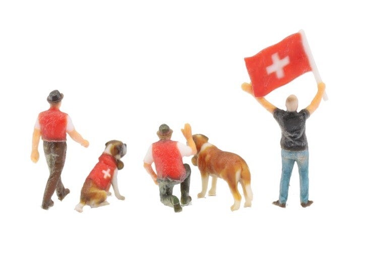 Figurenset Schweiz mit Gotthard-Fahnenschwinger Xaver, 2 Bernhardinern mit Fässchen und 2 Schweizern in Trachten