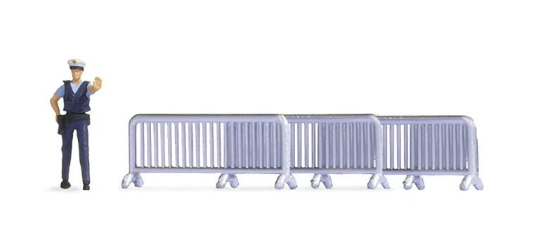 In dieser Szene sind ein Polizist und drei silberne Absperrgitter enthalten. Der Polizist trägt seine blaue Uniform mit Schirmmütze. Die Hand hat er warnend nach vorne ausgestreckt, um ein heranfahrendes Auto anzuhalten.