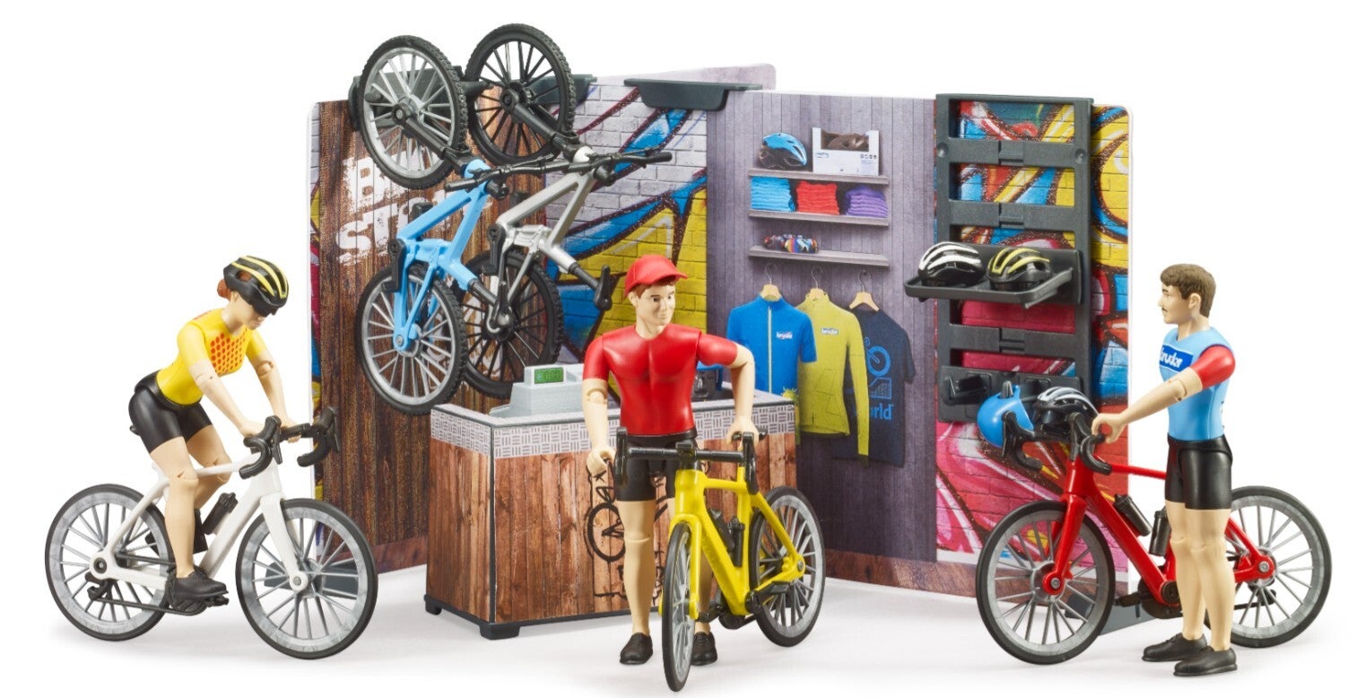 Der bworld Bikeshop ist auf einfachste Art und Weise mit den anderen bworld Themensets kombinierbar. Aus dem breiten Angebot von Bruder passen besonders gut der bworld Rennrad Fahrer (Art.-Nr. 63110) sowie die bworld Mountainbike Fahrerin (Art.-Nr. 63111) und der Jeep Wrangler Rubicon, als auch der BRUDER Roadster mit entsprechenden Fahrrädern (Art.-Nr. 02543 + 03485)