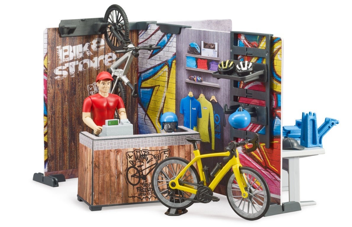 Für die vielen sportbegeisterten bworld Figuren gibt es einen neuen Anlaufpunkt. Der neue bworld Bikeshop von BRUDER bringt alles mit, was man von einem modernen Fahrradladen erwartet. In der umfangreich ausgestatteten Werkstatt können Fahrräder komplett gewartet werden. Hierfür stehen Montageständer und Werkbank samt Werkzeugen zur Verfügung. Im Shop kann man durch die Regale stöbern und sich nach neuem Zubehör, oder auch nach kompletten Fahrrädern umsehen. Die fachkundige Beratung übernimmt die ebenfalls enthaltene bworld Figur.
