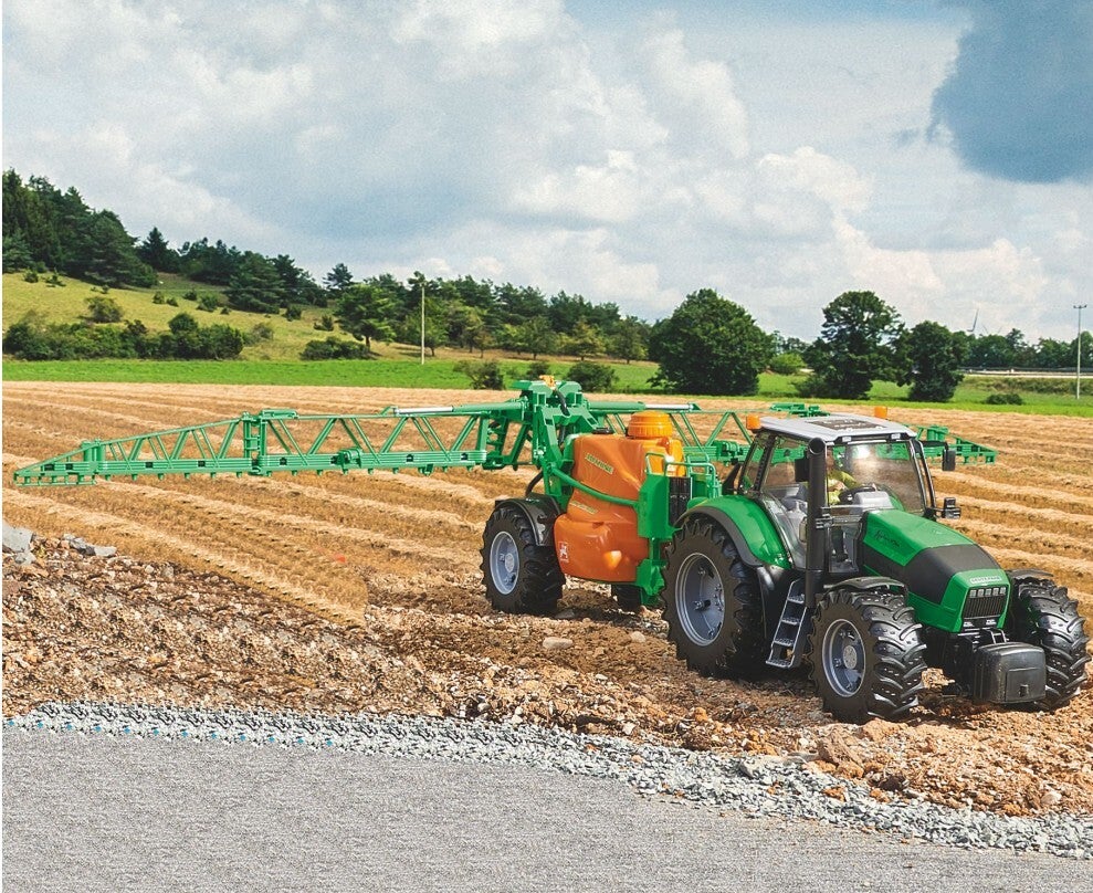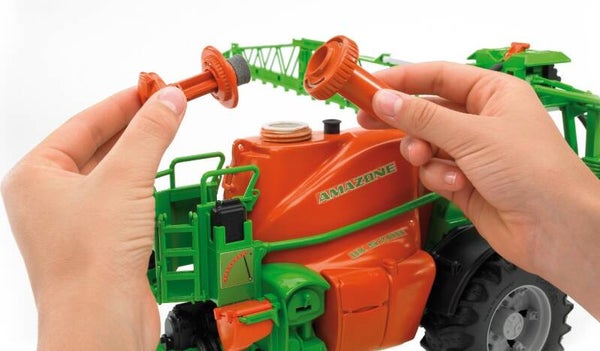 Düngen, Säen und der Pflanzenschutz sind unverzichtbare Bestandteile der Landwirtschaft. Die Firma Amazone hat sich seit 125 Jahren auf die Entwicklung von Arbeitsgeräten für diese Bereiche spezialisiert und stellt u.a. auch Anhängespritzen für den Pflanzenschutz her. Ein Topmodell ist dabei die Feldspritze 5200 der UX Serie; mit Arbeitsbreiten von bis zu 40 Metern, das Fassungsvermögen von über 5.000 Litern ermöglicht es, große Flächen ohne Unterbrechung zu besprühen. BRUDER als der führende Hersteller von landwirtschaftlichen Fahrzeugen mit modellmäßigen Design hat eine solche Anhängespritze im ca. Maßstab 1:16 entwickelt und unterstreicht mit den vielen realistischen Funktionen dieses Modells seine herausragende Marktbedeutung. Wie in echt verfügt die BRUDER Feldspritze als hervorstechendes Merkmal über eine voll funktionsfähige Spritzeneinheit mit befüllbarem Wassertank, ein ausgeklügeltes Pump- und Schlauchsystem verteilt spielend leicht das Wasser auf die ?Felder unserer kleinen Landwirte? und mit einer Auslegerbreite von knapp 1 Meter lassen sich auch größere Spielflächen im Freien ?rationell? bearbeiten. Weitere realistische Details wie ein ausklappbarer Stützfuß, eine ausfaltbare Trittleiter und eine höhenverstellbare Auslegereinheit erhöhen neben anderen Funktionen den Spielspaß mit diesem tollen und sicherlich einzigartigem Spielgerät.