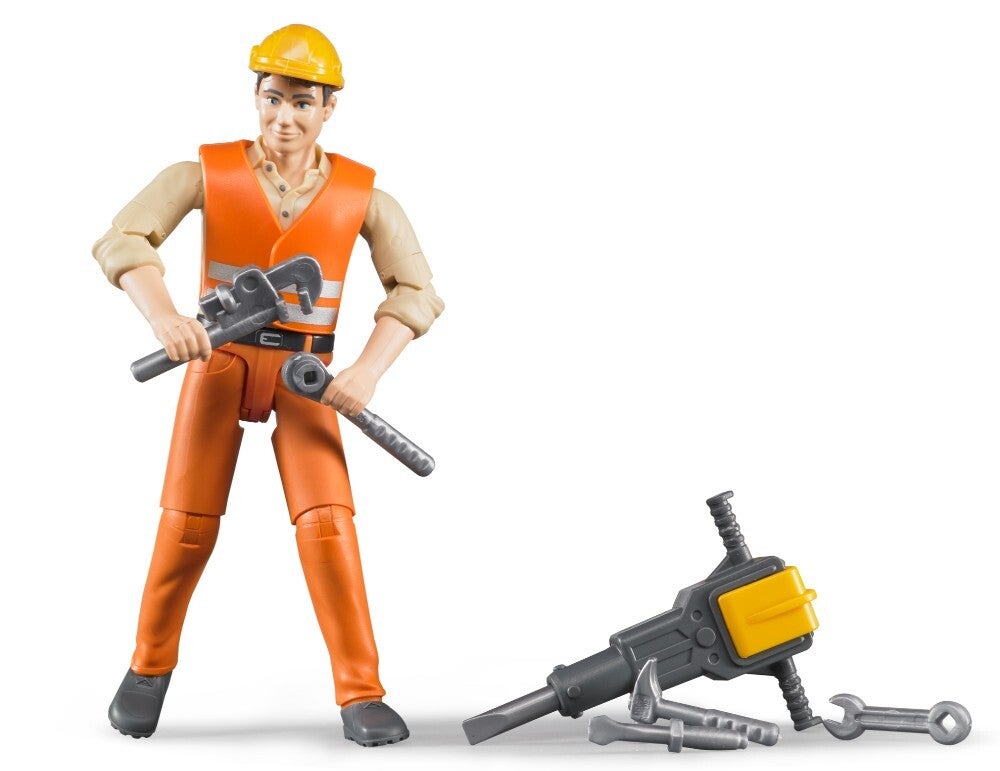 Es gibt zahlreiche, bis ins Detail nachgebildete, LKW´s, Baumaschinen, Bagger, Kräne und vieles mehr in dem großen Sortiment von BRUDER. Die ideale Ergänzung hierzu sind die Spielfiguren, die der gesamten Spiellandschaft nochmals mehr Spielspaß und Realitätsnähe verleihen, sowie das Rollenspiel und Kreativität der Kinder anregen. Der Bauarbeiter mit Zubehör ist die ideale Ergänzung zu sämtlichen Baufahrzeugen aus dem Sortiment. ?Sicherheitshalber? ausgestattet mit Bauhelm und Warnweste, kann die Arbeit direkt beginnen. Zusätzlich sind ein Presslufthammer und fünf weitere Werkzeuge in dem Set enthalten, um zahlreiche Spielszenarien nachspielen zu können. Die Warnweste und der Bauhelm sind abnehmbar.