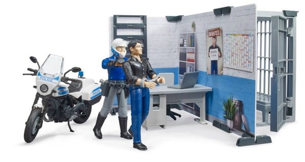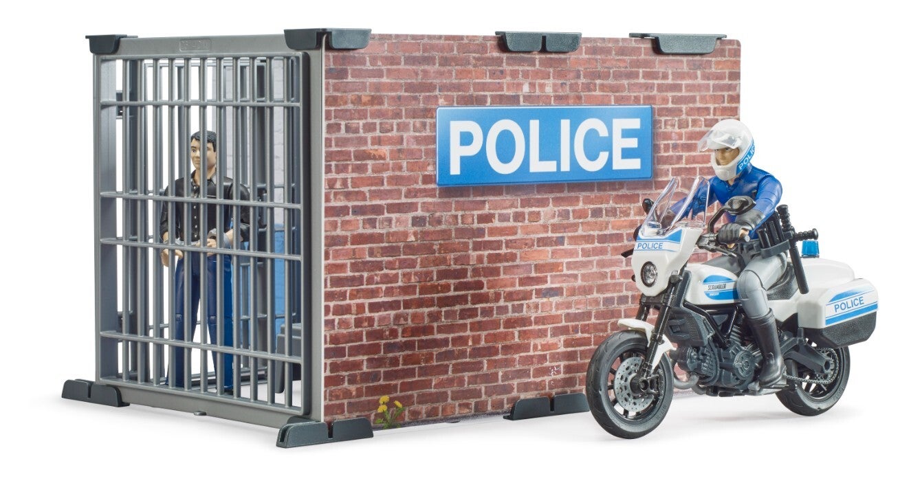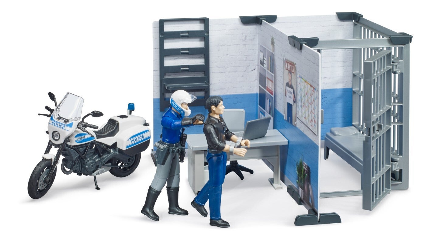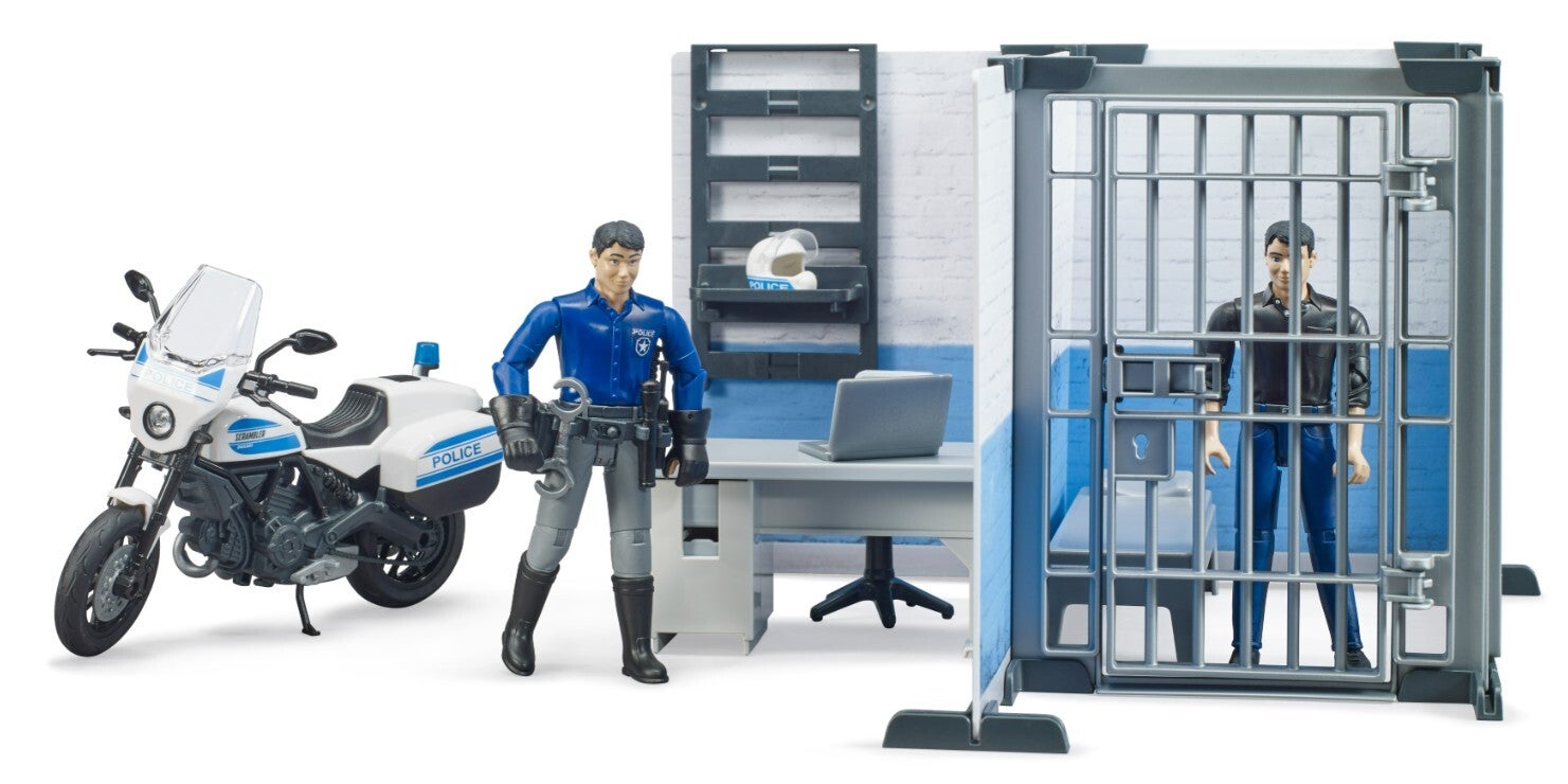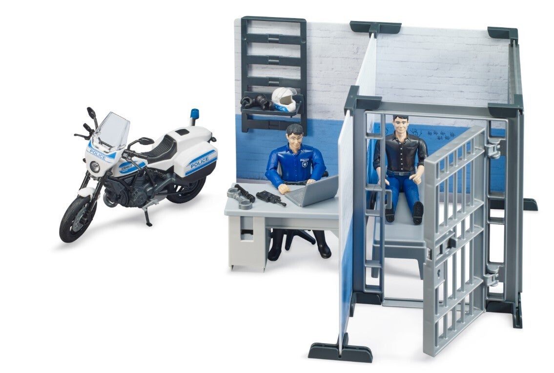 Für die Vielzahl an BRUDER Polizeifahrzeugen gibt es jetzt neu, die bworld Polizeistation als koordinierende Stelle. Im Bürobereich kann der Polizist mit modernster Ausstattung jeden Einsatz koordinieren und verfolgen. Ist ein Verdächtiger verhaftet, kann dieser im Zellenbereich untergebracht werden. Um selbst schnell zu einem Einsatz zu kommen, steht die Scrambler Ducati als Polizeimotorrad direkt vor der Polizeistation.